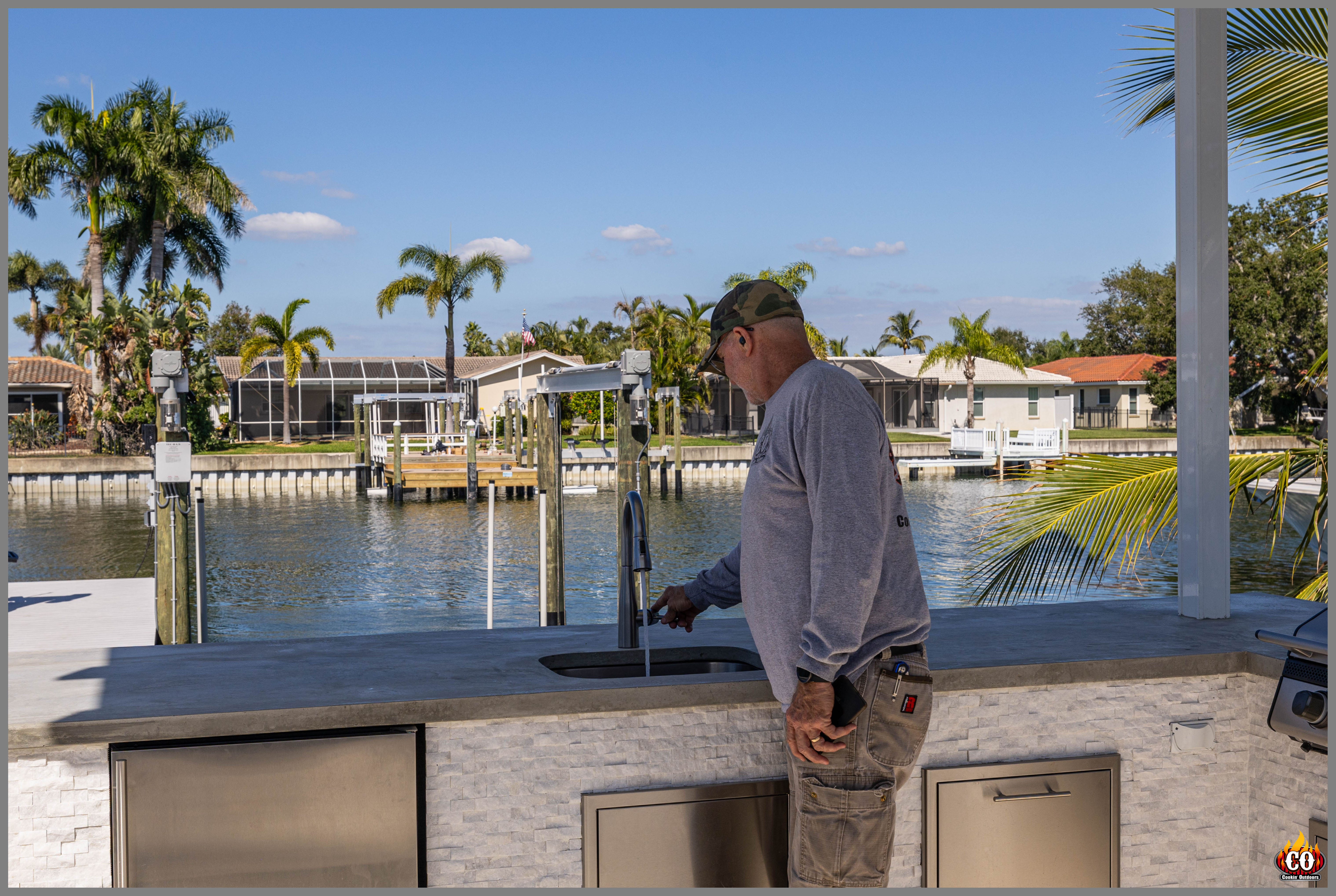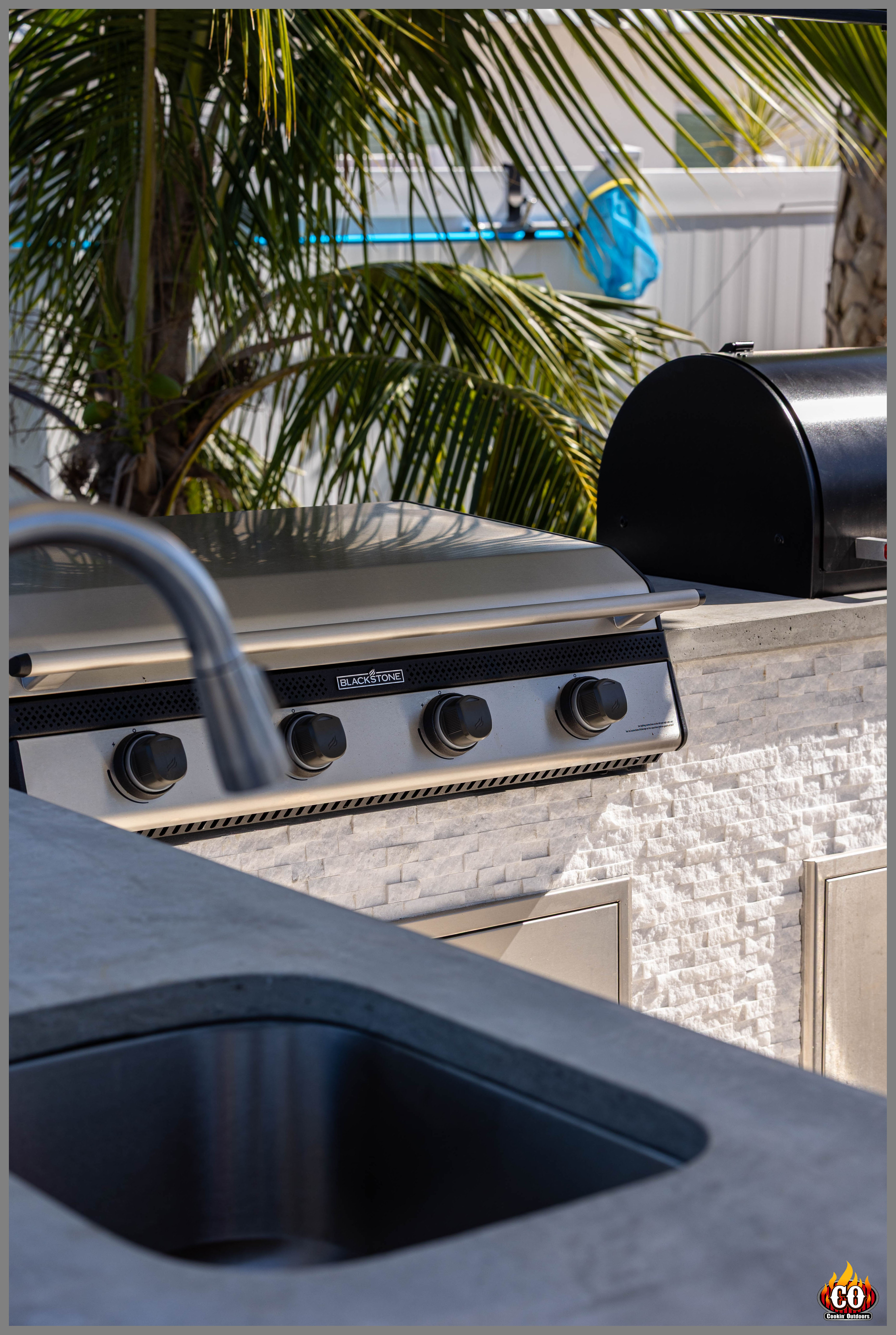 What truly elevates this project is the custom 22 linear feet of concrete outdoor kitchen cabinetry, wrapped in a premium stone veneer selected from Tile Outlets of America. The design features:
