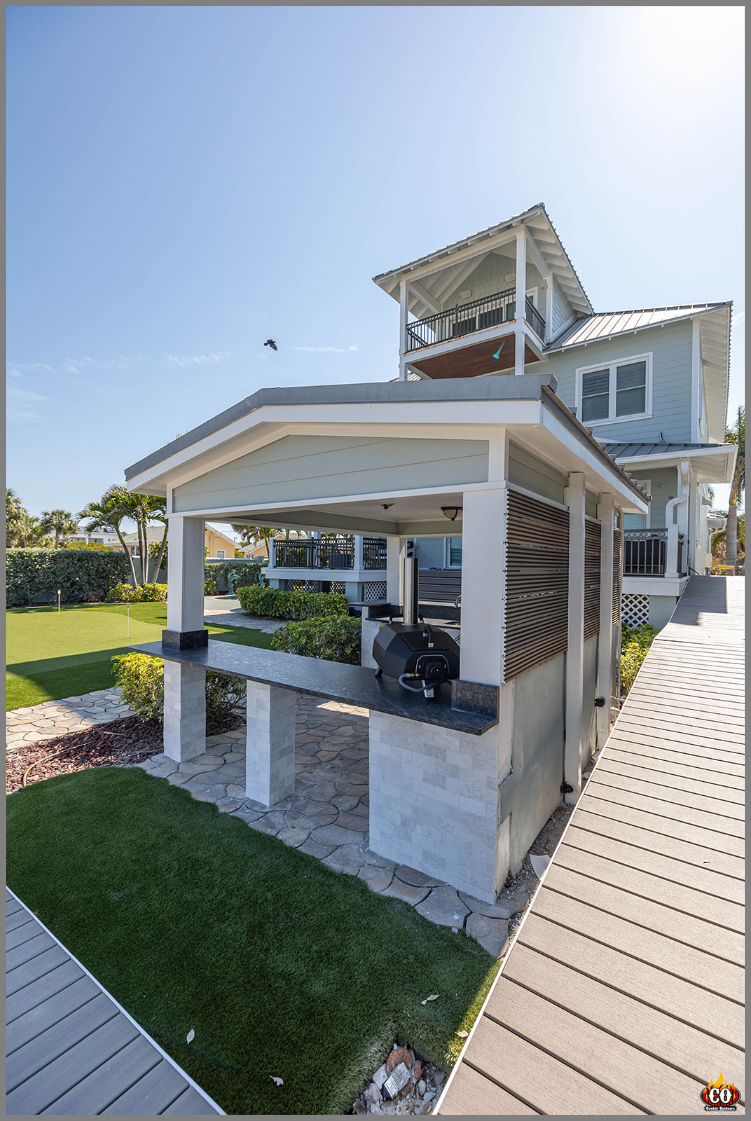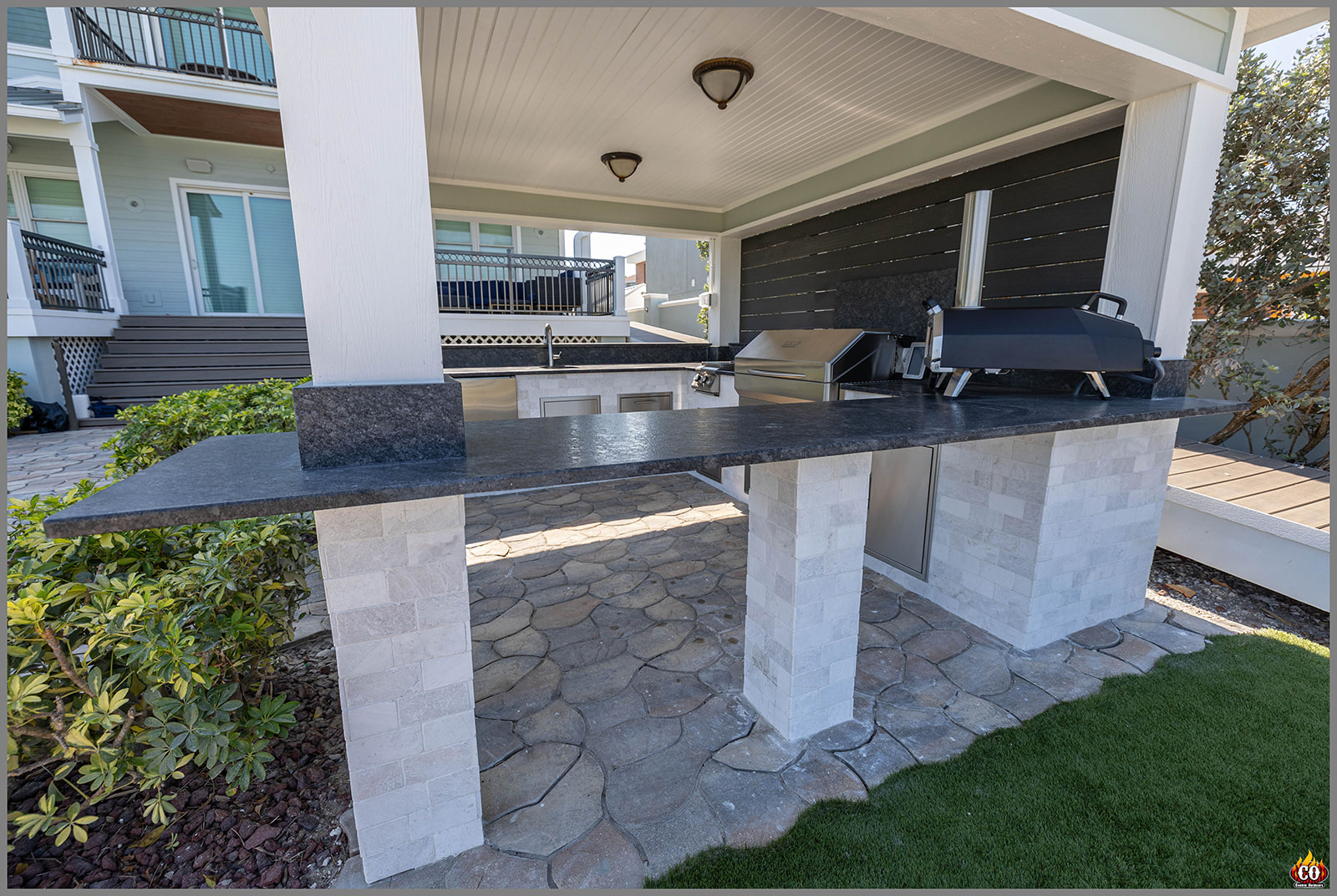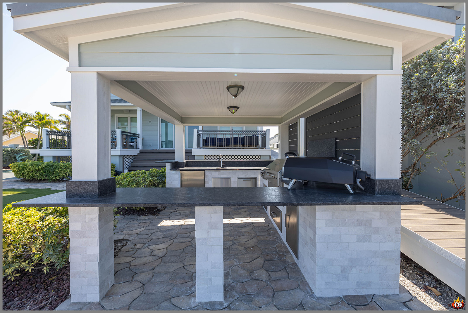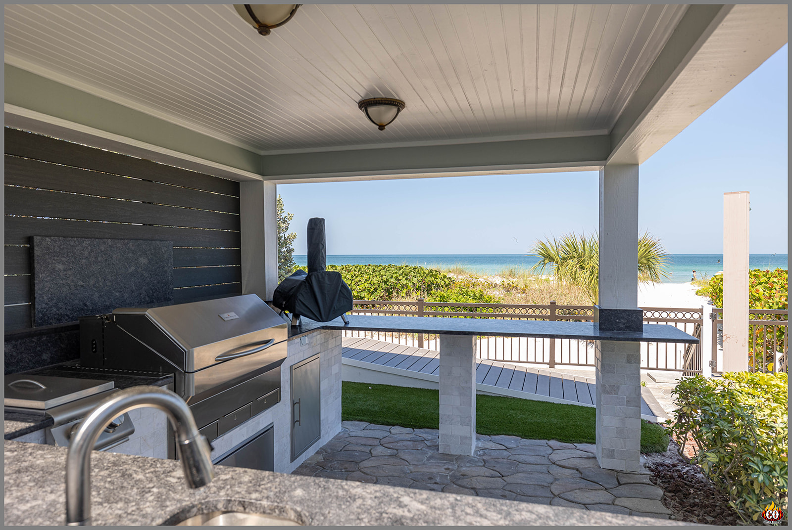 U-Shaped Outdoor Kitchen with Bar Overhang, pedestal bar, and slat wall in Indian Rocks Beach, FL custom designed and built by Cookin' Outdoors
