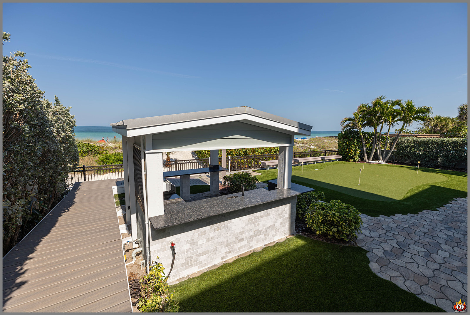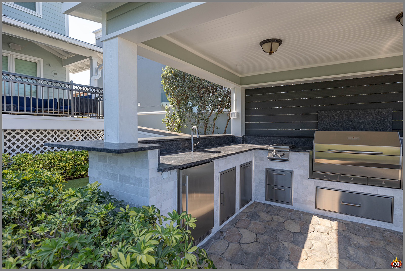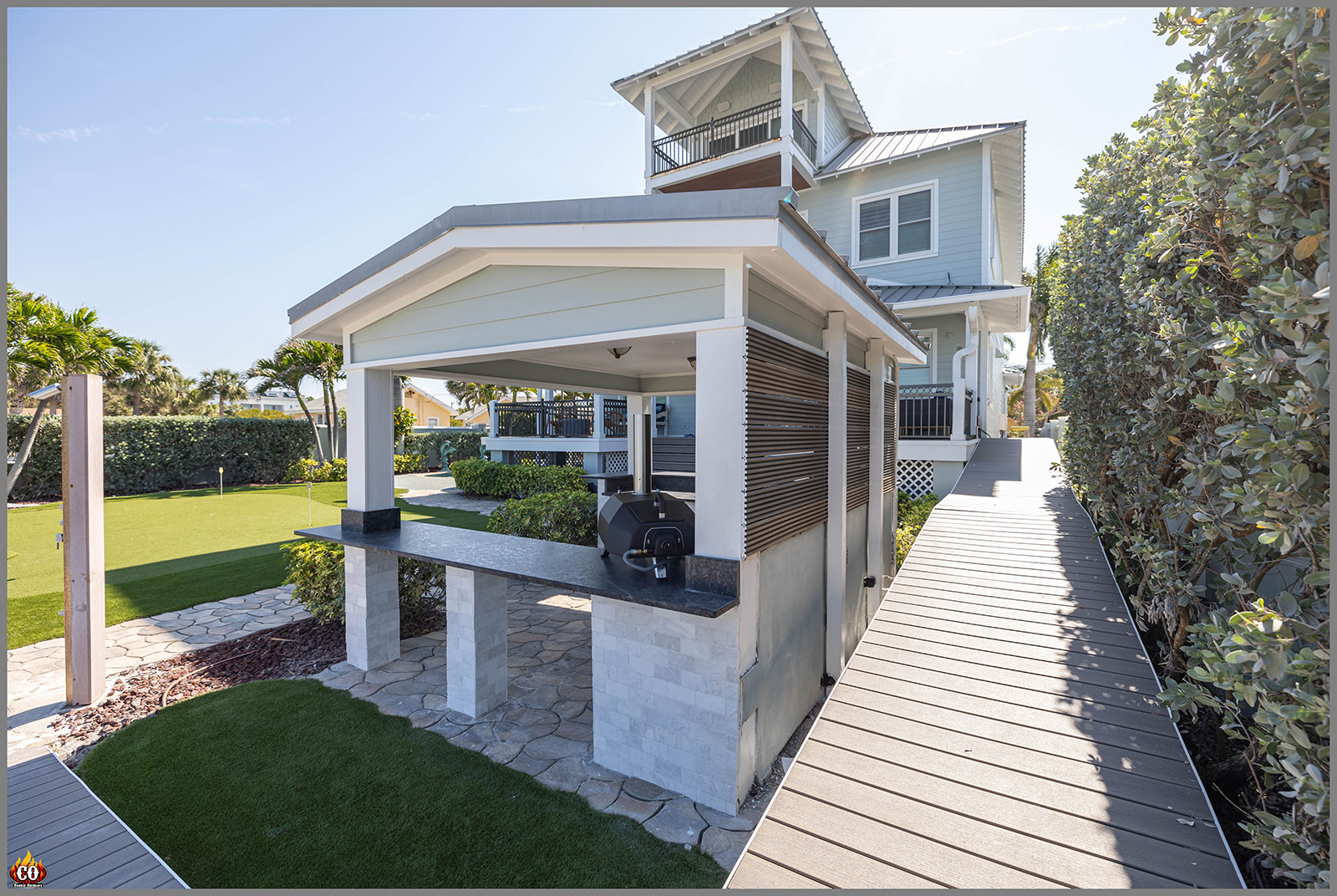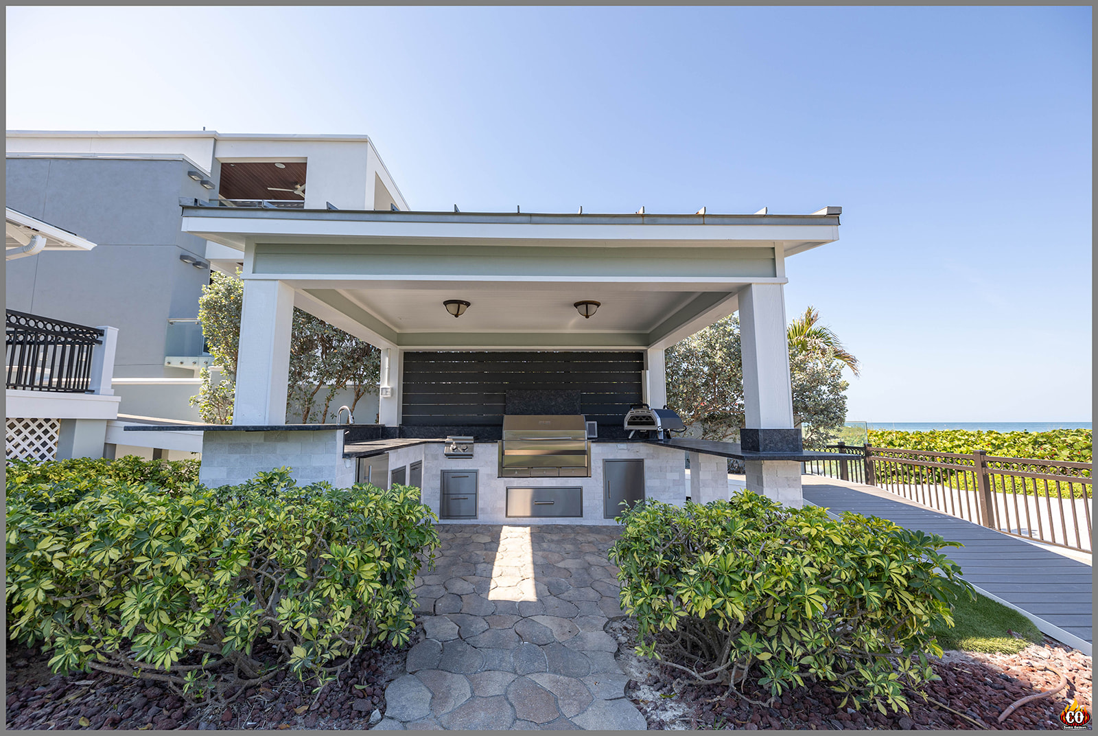 U-Shaped Outdoor Kitchen with Bar Overhang, pedestal bar, and slat wall in Indian Rocks Beach, FL custom designed and built by Cookin' Outdoors