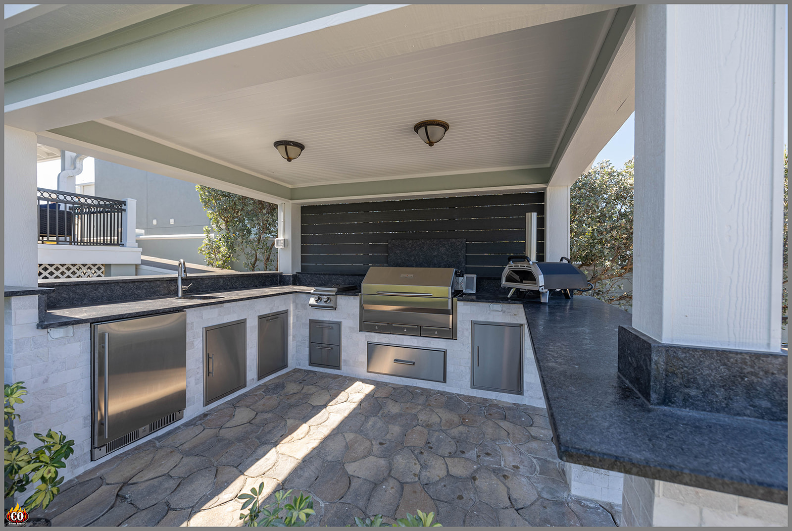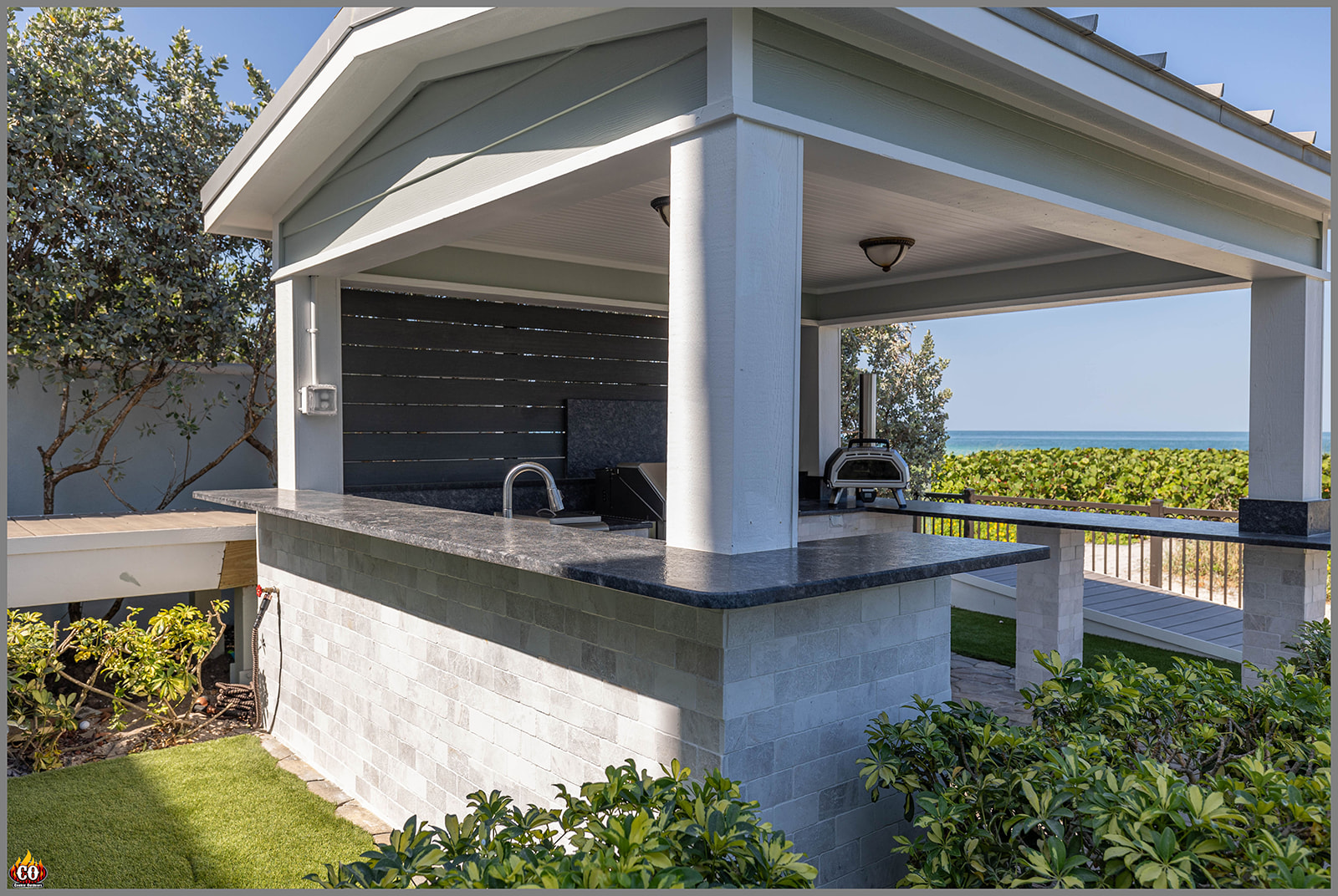 Here is a 20’ outdoor kitchen with 15’ high bar. Above the outdoor kitchen is a 11’ wide board slat wall. This project also includes a 12’ pedestal bar with stone accent finish! Outdoor kitchen, high bar, pedestal bar, and slat feature wall in this project are all designed and built by Cookin' Outdoors. A luxury concrete u-shaped 20’ outdoor kitchen with pedestal bar and slat privacy wall to make their beach paradise complete.Including a Memphis Grills Elite ITC3 Pallet Grill with 36” single drawer, Blaze double side burner with double drawer, the owners Ooni pizza oven with Blaze single door, Blaze pull-out trash, a sink with a single door, and a Blaze Refrigerator. This design provides an outdoor kitchen with stone finish, slat feature wall, high bar, and pedestal bar, elevating their ocean view in this Indian Rocks Beach, FL luxury home!