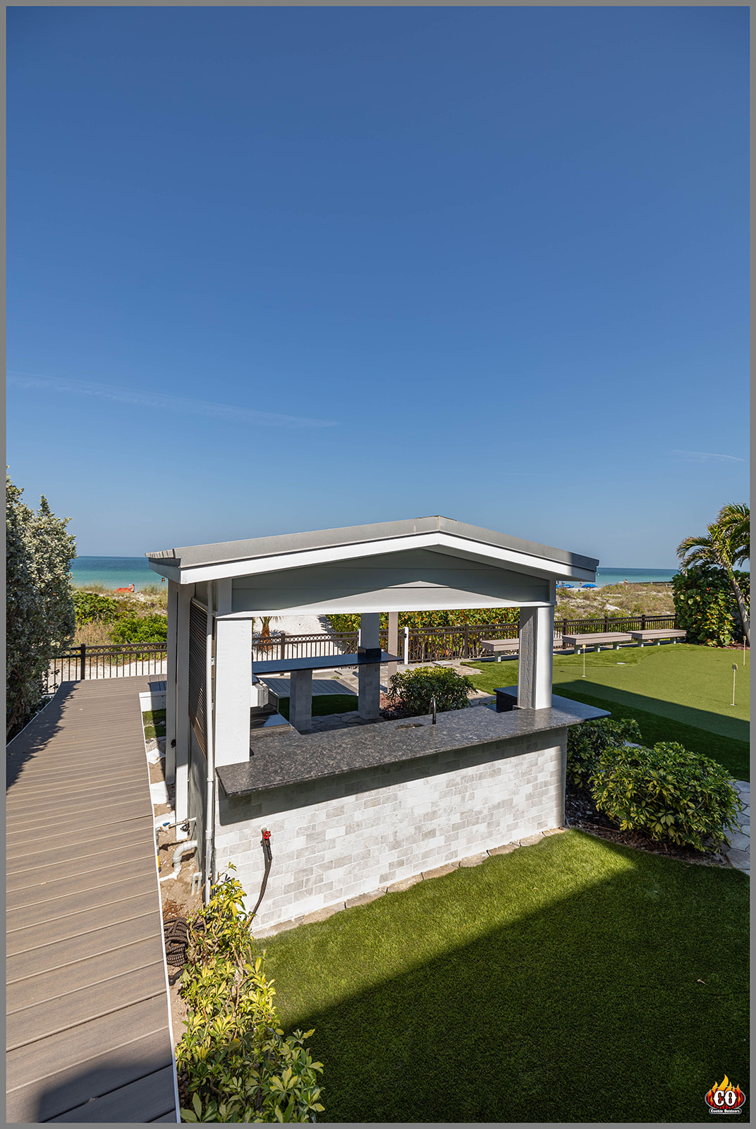 This u-shaped outdoor kitchen with bar overhang, pedestal bar, and slat privacy wall were designed custom for our customer’s space. The kitchen was custom built to fit perfectly in this beach homes existing gazebo structure. The outdoor kitchen includes two custom outdoor bars. One bar overhang on the sink side and one pedestal bar on the opposite side of the gazebo that wraps around the column. This outdoor kitchen includes everything our Indian Rocks Beach new outdoor kitchen owner asked for. A refrigerator, sink with single door underneath, pull out trash, side burner and double drawer, Grill and single drawer, and a single door. This design also includes a privacy slat wall behind the outdoor kitchen, all custom built by Cookin' Outdoors team to make our clients specific needs possible in their Florida beachfront back yard. Come to us with your outdoor fantasy and we will make it your everyday. From outdoors kitchens to outdoor fireplaces to pergolas to custom gazebo structures, we are here to custom build your desired outdoor space! All questions you have along the way are welcomed, we are here for you every step of the way! We are a small family run Tampa business. Our clients are our family, we got you! We will make your project to code, with our licensed contractor, Scott Taylor, behind every detail. We will provide electrical outlets for convenience and for any appliances in the outdoor kitchens, firepits, or pergolas. There are always options for unique upgrades, such as, pop-up outlets or slat privacy walls like in this project! This custom-built outdoor living space makes the outside feel more livable and entertaining. Bringing everyone outside more often to enjoy the gorgeous Florida Indian Rocks beach. Cookin' Outdoors works with each costumer until their design ideas become their every day! Our family owned Cookin' Outdoors team bring our love for quality living to you! Welcome to the family, new luxury custom built outdoor kitchen owner!