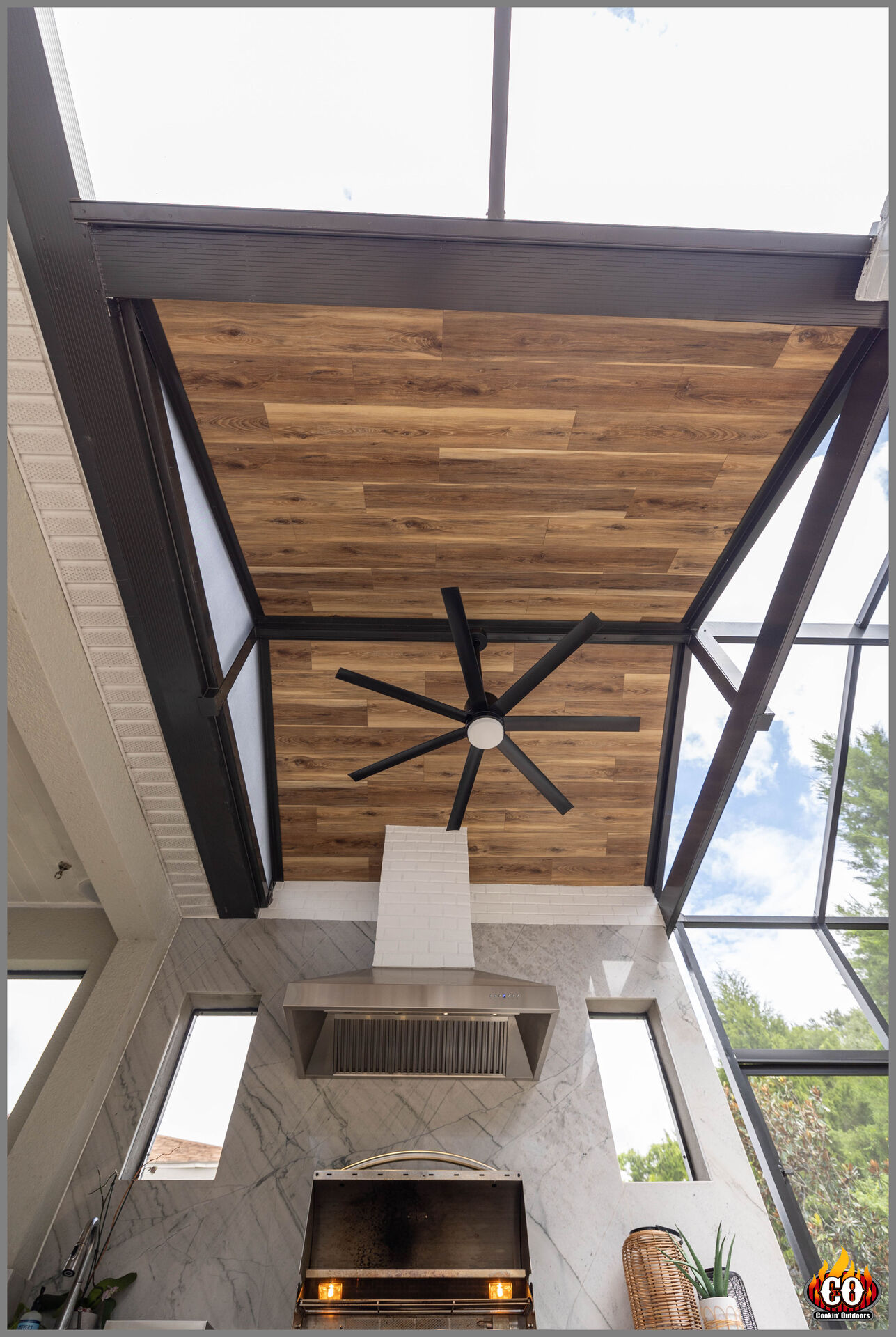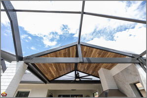 Custom Designed Patio Roof Extension in Land O' Lakes, FL by Cookin' Outdoors with Knotty Pine Tongue and Groove Ceiling with Exposed Rafters and Galvalume Metal Roofing